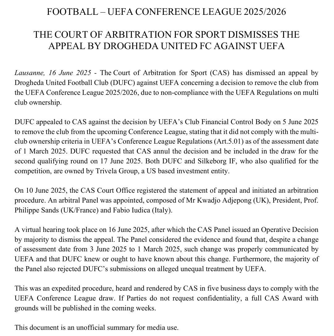 The Court of Arbitration of Sport has ruled against Drogheda United’s appeal to UEFA’s decision to remove them from the UEFA Conference League this season, meaning that Drogheda United have become the first club ever to be removed from European competition owing to multi-club ownership rules.